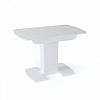 Недорогая функциональная и стильная модель. Каркас стола изготовлен из ЛДСП, цвет белый или венге. Столешница из МДФ с закаленным стеклом, матовым или глянцевым на выбор. Имеет полуовальную форму, размер 110 см с возможностью увеличения еще на 30 см. Опирается на одну ножку, переходящую в две плоские опоры на полу.